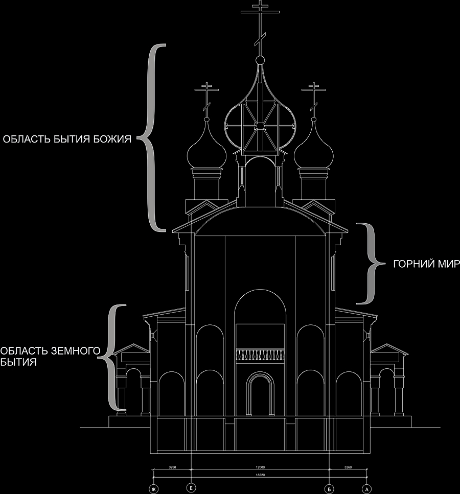 (ПРЕДЛОЖЕНИЕ КОНЦЕПЦИИ ПО СИСТЕМЕ РОСПИСИ ХРАМА) В данной постройке объем храма делится на основной и “предваряющий”. Соответственно и система росписи будет строиться по принципу единения церкви новозаветной и церкви ветхозаветной. Нартекс, расположенный у западной стены основного объема, символизирует ветхозаветную церковь. При входе в храм мы оказываемся в просторном тамбуре, освещенном боковыми окнами. Здесь находятся списки тех, кто строил или помогал строительству этого сооружения. По древней традиции именно при входе располагались портреты ктиторов и воздавались почести людям, совершившим такое благодеяние. Но не ради тщеславия строятся храмы на Руси, а только во славу истинной веры. Посему авторы и зодчие скромно упоминают о своем участии в списках при входе. Ибо тот, кому будет интересно узнать, чьими стараниями воздвигнут храм, задержится и прочтет, либо пройдет не задерживаясь. Далее верующего встретят ветхозаветные праотцы, стоящие у начала времен и предваряющие возникновение христианской веры. За ними на следующем отрезке стены располагаются пророки, развернутые в три четверти по направлению к основному объему, тем самым, приглашая войти в пространство четверика. На втором этаже трапезной по сторонам центрального прохода, вверху пишутся святые в медальонах (церковь Успения на Волотовом поле), а ниже разворачиваются события Ветхого завета. На южной стене это композиции на темы сотворения Мира и событий в Райском Саду, завершающиеся сценой изгнания из Рая. На противоположной стене композиции иллюстрирующие книгу “Исход”. Тем самым повествуется о первородном грехе человечества и о том, что с тех пор как человечество в лице Адама было изгнано из Рая, оно находится на пути к спасению и движется по этому пути, ведомое Господом (Моисеем). Тематика стенописей четверика традиционна – Христологический цикл, Богородичный цикл, Евангельские события и Деяния апостолов, составляющие суть православия - это сцены исцелений, изгнания бесов и так далее. Верх храма символизирует Церковь Небесную через образы Апостолов, Пророков, Архангелов, Серафимов и Херувимов. Следовательно, купол барабана – обозначает небо, жилище Бога, который и изображается в образе Христа-Пантократора. Простенки барабана, ввиду своей малой площади, не могут быть использованы под роспись. К тому же маленький диаметр центрального барабана, делает затруднительным визуальный доступ к этим участкам внутренней поверхности барабана. Подступы к Богу охраняет его воинство Серафимы, расположенные на поверхности свода основного объема. Своды – это небо, следовательно, своды будут окрашены в синий цвет, на них изображаются серафимы и сияние, исходящее от Господа.На северной и южной стенах, в верхних, боковых компартиментах изображаются символы евангелистов (тетраморф), а на восточной и западной стенах – символы четырех царств. От основных настенных росписей эти изображения отделяет карниз, идущий поверх арочных членений стен четверика. Сама же роспись основного объема заключает в себе четыре основные, доминирующие композиции богородичного цикла, заключенные в естественные рамки, образованные пилястрами и арочными выступами над ними. Это “Покров Богоматери”, расположенный на восточной стене – один из любимейших изводов на Руси. Во время служб