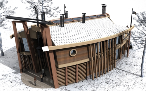 ЗАПИСКА. Требовалось запроектировать небольшой гостевой дом на территории базы отдыха в Московской области, включающий в себя ЧЕТЫРЕ номера с санузлами и общий, каминный зал. Данная постройка предназначена для отдыха семей, которые встречаются и общаются в каминном зале и на просторной, общей террасе. Зал также дополнительно освещается через верхний световой проем. Два номера на первом этаже имеют выход на общую террасу. Номера на втором этаже оборудованы индивидуальными террасами Конструкции выполнены из железобетона с отделкой деревянными элементами.